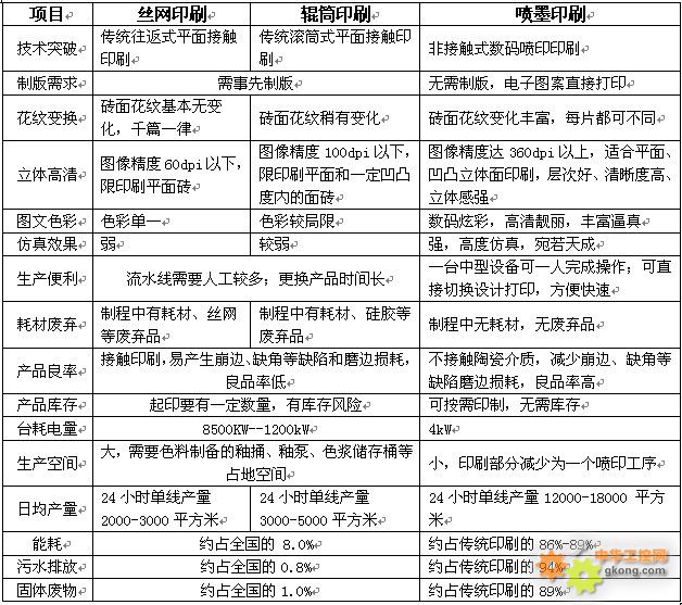瓷磚的主要生產過程為:備料-壓制成型-干燥-施釉及印花-燒成—拋光/打蠟。其中施釉及印花過程(即印刷過程)是窯前彩圖瓷磚生產的關鍵,其工藝方式和過程較大程度地決定了原材料消耗率、正品率、產品檔次、生產成本、能耗、污染、排放等因素。作為陶瓷生產工藝核心的印刷技術已經歷