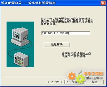 (3) 向下進行,輸入設備地址,組態王關于Modbus TCP連接方式的地址格式為IP[:Port] Address(IP:設備IP地址,Port:設備地址端口,默認為502,Address:設備地址),該系統中實際地址設置為192.168.1.5:502 01,如圖8;