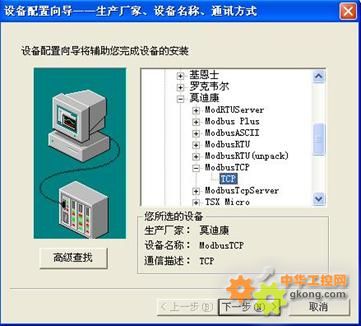 (1) 在組態王工程項目里,選擇“設備”,新建一個“設備配置向導”,在“PLC”的選項中,選擇莫迪康ModbusTCP下的“TCP”,如圖7所示。