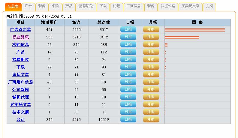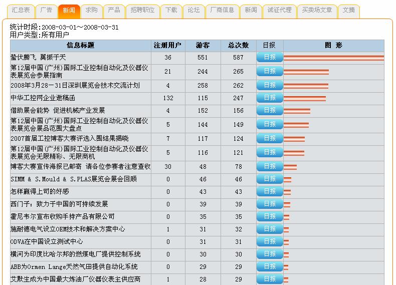 如下圖所示,可以清楚的了解每個時段,企業廣告、新聞、產品、文摘等各欄目的總體訪問情況。從中可以得知網友關注的重點,以便加強相關方面的推廣。