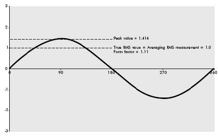 在測量一個純正弦波(僅限于純正弦波)時,簡單的測出平均值(0.636倍峰值),再乘以波形因數1.111(即0.707倍峰值)所得到的數值是完全正確的,這個數值也被稱為有效值。這種方法被廣泛用于所有的模擬測量儀(此時平均值是靠線圈運動的慣性和阻尼作用來實現的)和所有舊式、儀表和大多數電流表數字萬用表上。這種技術被稱為“平均讀數,按有效值校準”的測量方法。