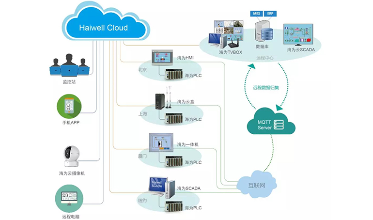 | 智慧工廠注重對異地數據整合,進而實現統一監控管理。海為所有云設備都支持MQTT協議,通過互聯網,傳輸到MQTT服務器上,遠程中心數據庫對發來的數據進行存儲,供ERP、MES系統調用。 智慧工廠看重集中監控顯示。海為云攝像機可輕松實現視頻遠程監控;大屏控制器TVBox可實現單屏,多屏合一顯示,再通過海為云平臺,把各地的設備畫面、視頻監控集中顯示在大屏上,實現大屏電子看板功能。 智慧工廠關注異地數據變量二次開發。海為云組態軟件,通過云平臺,靈活調用各地設備變量數據,進行二次開發組態,讓工程師組網監控更加得心應手。 |