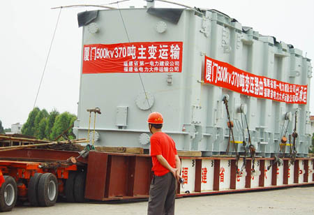 該變壓器由省電力大件運(yùn)輸公司負(fù)責(zé)運(yùn)輸,由海滄碼頭運(yùn)至廈門500千伏變,運(yùn)輸路程為56公里,運(yùn)輸9天,沿途需經(jīng)過海滄、杏林、同安,經(jīng)過15座橋梁,需排除郵電、通訊、電力、有線電視網(wǎng)絡(luò)線等空中障礙100多處。其中運(yùn)輸難點(diǎn)為下穿廈漳高速公路鳳山立交橋,因高度受限必須采用卸車、拖越、裝車?yán)m(xù)運(yùn)的方法前后就需3天時(shí)間,整個(gè)運(yùn)輸過程約9天時(shí)間。目前,省超高壓局已完成了所有橋梁和路面的加固和技術(shù)論證,預(yù)計(jì)6月10日開始運(yùn)輸,6月18日運(yùn)抵變電所內(nèi)就位。