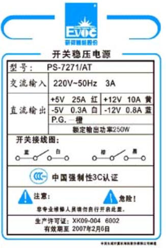 研祥公司PS-7271/AT開關電源于2004年8月19日通過國家認證機構的“CCC”認證,并獲得“CCC”認證證書,證書號為2004020907000392。