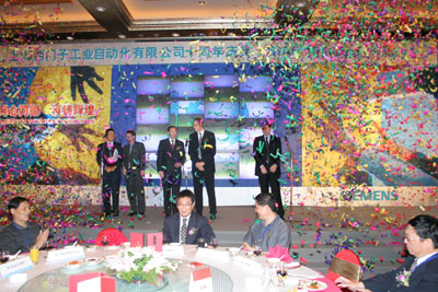 2005年6月15日,上海西門子工業(yè)自動(dòng)化有限公司(SIAS)在上海舉行公司十周年慶典。支持SIAS發(fā)展的各地客戶,上海市外資委,西門子(中國)有限公司副總裁、自動(dòng)化與驅(qū)動(dòng)集團(tuán)總經(jīng)理何維克先生,自動(dòng)化與驅(qū)動(dòng)集團(tuán)首席財(cái)務(wù)官彭瀾韜先生,SIAS歷屆的董事會(huì)、經(jīng)理層,以及SIAS全體員工聚集一堂,為這個(gè)特殊的日子舉杯慶賀。西門子的管理層手拉手,同聲宣布上海西門子工業(yè)自動(dòng)化有限公司十年慶典的正式開始!公司總經(jīng)理陳凌霄先生對(duì)所有關(guān)心SIAS發(fā)展的各行業(yè)客戶,上海市政府,SIAS奠基人,歷屆的董事會(huì)、管理層,和Siemens德國和Siemens中國的所有同事, 和SIAS全體員工表達(dá)了誠摯的感謝!