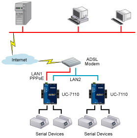 以太網 PPP 協議 (PPPoE) 是在以太網上建議虛擬撥號技術的協議。由于對帶寬的需求, PPPoE 的使用越來越普及,它可以方便使 PC 連接到高速網絡。圖中顯示的是使用 UC-7110 的新的 PPPoE 功能建立以太網連接的架構。在這個案例中, PPPoE 用于 UC-7110 的一個以太網口和一臺 ADSL modem 連接, 因此,使用 UC-7110 可以在 Internet 主機和串口設備之間建立一個數據通道。