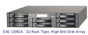 冷峻外型、低靜音的DAS-208SA在硬件設計展現了進階級儲存的高效能、高數據保護度的架構。搭配Intel 80321 600MHz 64-bit的核心處理器,內存可擴充至1GB。八顆Serial ATA硬盤各自擁有獨立連接信道,讓聯機及數據傳輸更有效率。DAS-208SA采用了進階控制器,可自動兼容于不同容量如目前市場上最大單顆400GB的Serial ATA硬盤,使得用戶可以更彈性使用高性能Serial ATA硬盤,自由的建構出自己的儲存系統。