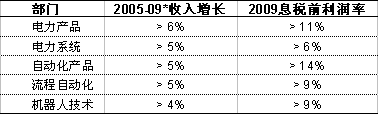 2005年9月6日,瑞士蘇黎世訊 – 全球電力和自動化技術領導廠商ABB集團今日宣布了2005至2009五年中期發展目標。ABB集團同時提出了強化改進業務執行,從更寬的領域去創造價值的戰略,包括專注于業務業務增長、改善盈利、資本利用和增加現金。