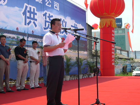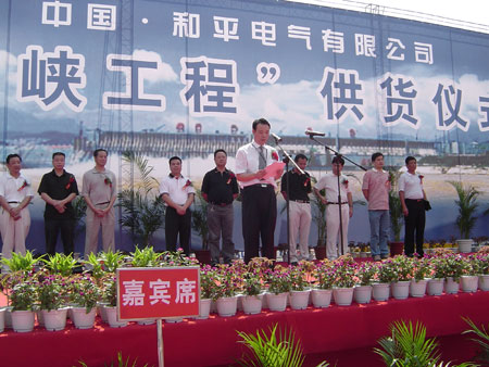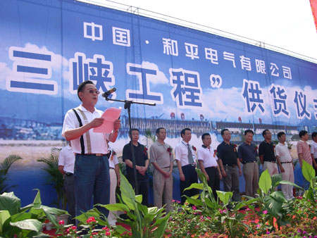 9點30分,柳市鎮經濟發展事務所所長鄭國光先生主持儀式開始。和平電氣有限公司董事長陳道賢、柳市鎮鎮長陳宣安、中國三峽總公司工程處處長袁建偉、樂清市副市長林培根分別發表講話。樂清市副市長林培根先生在講話中提到,三峽工程是舉世矚目的水電工程,和平電氣有限公司生產的軟起動裝置,能在美國、以色列等強手如林的跨國公司參與的激烈競爭中取勝,標志著我市某些電氣產品的研發制造已經達到國際水平,也標志著我市電氣產業正進入高端核心技術發展的新時代。他希望和平電氣有限公司以這次中標供貨為契機,堅持走高技術、高品質的發展道路,為提升樂清市電器產業層次,打造好中國電器之都,做出自己應有的貢獻! ▲ 圖為公司董事長陳道賢致謝辭 |