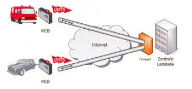 在這個案例中 , 一臺電腦使用無線 UMTS 或 GPRS 卡來定位車輛 . 通過無線局域網(wǎng) , 活躍區(qū)域內(nèi)設(shè)備來監(jiān)控車輛信息 . 當(dāng)車輛進(jìn)入這個無線局域網(wǎng)區(qū)域時 , 它就可以連接到控制中心來下載信息 , 或從總部接收并更新信息。
