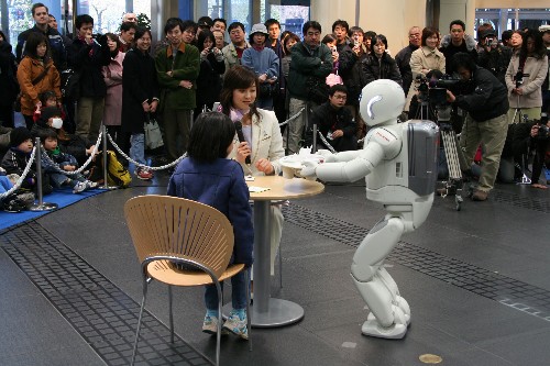 “阿西莫”是本田公司開發(fā)的雙腳步行機器人,于2000年11月首次在橫濱國際和平會議中心舉行的機器人展示會上亮相。“阿西莫”步行方式接近人類,能與人進行簡單會話,曾用于日本的商場、學校等,深受人們喜愛。