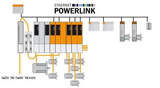 通過B&R POWERLINK高速實時以太網技術連接各伺服站,最大站間距離100米,構成分布式的伺服驅動系統。對于大型長線機器而言, ACOPOSmulti使得系統的結構變得更加緊湊,接線時間及電纜的消耗都比較少。