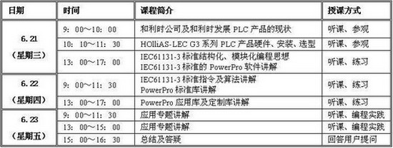 培訓期間,和利時公司為學員提供全套的G3 PLC資料以及免費工作餐,培訓時間及課程內容安排如下: