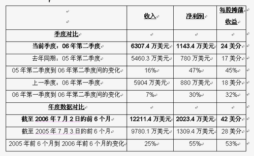 2006年和2005年第二季度的財報包括了在2005年5月9日收購的DVT公司的業務情況,以及與收購相關的稅前分期攤還費用:2006年第一和第二季度均為114.3萬美元,即2006年前6個月為228.6萬美元;2005年第二季度和前6個月為76.2萬美元。