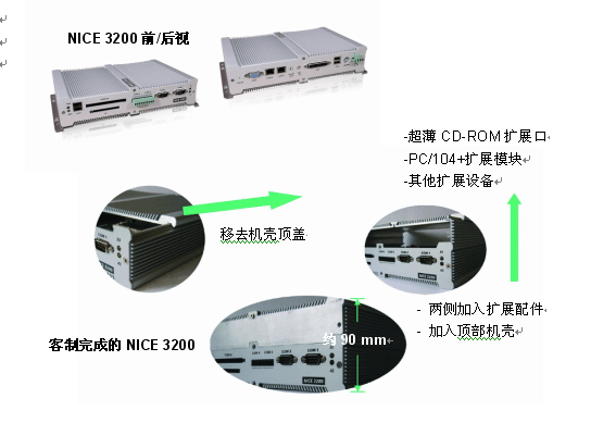 NICE 3200系列產品特殊的第二層系統擴展可依據您的需求便利的調整機殼高度,大約90mm的高度;調換底板,加入擴展配件,如超薄CD-ROM擴展口,PC/104+擴展模塊,以及其他擴展設備,快速客制為您獨有的NICE產品。(第二層系統擴展圖如下所示)
