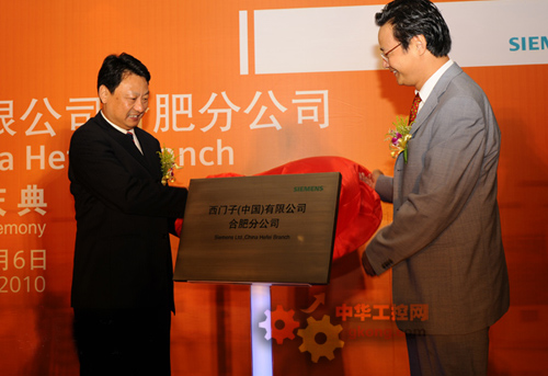 合肥市副市長高維嶺(左)與西門子(中國)有限公司副總裁兼安徽省總經理王偉國共同為西門子合肥分公司揭牌。