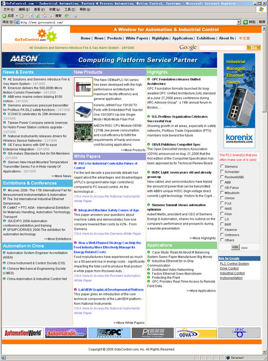 目前GoToControl已開通的主要頻道有:新聞、產品、白皮書、行業(yè)集萃、應用案例、解決方案及展會等。業(yè)內各廠商可以直接向網站客服提交公司新聞和產品等信息,通過審核后,將第一時間刊登在www.GoToControl.com的相應頻道上。