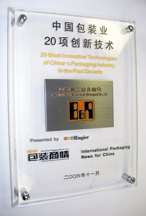 2006年11月28日晚,由中國(guó)包裝機(jī)械工業(yè)協(xié)會(huì)及榮格出版共同舉辦的1996~2006十年包裝技術(shù)創(chuàng)新獎(jiǎng)評(píng)選頒獎(jiǎng)晚會(huì)在上海巴黎春天大酒店舉行,貝加萊因?yàn)樵谥袊?guó)包裝市場(chǎng)熱收縮膜領(lǐng)域卓越的影響力和技術(shù)創(chuàng)新得到了客戶、專家委員會(huì)和同行的認(rèn)同,獲得了“中國(guó)包裝業(yè)10年創(chuàng)新技術(shù)”獎(jiǎng)。