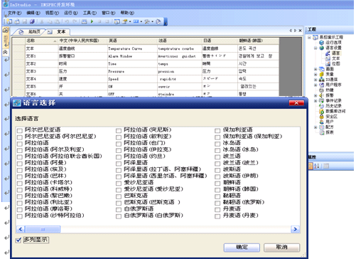 “易控(INSPEC)”組態軟件的多語言功能包括“系統多語言”和“工程多語言”。系統多語言針對設備制造商或系統集成商的工程技術人員。也就是說世界各地的工程技術人員都可以用自己熟悉的語言來使用“易控(INSPEC)”來開發自己的工業自動化監控系統。工程多語言則針對最終用戶,它使得銷往世界各地的設備或者系統都可以讓當地的操作人員以自己的母語來進行監控操作,而且為了銷往不同國家的設備或者系統,雖然語言界面不同,但設備制造商或系統集成商所作的工作僅僅就是一個翻譯的工作,傳統的大量開發和測試工作都因為“易控(INSPEC)”的多語言功能而省略。