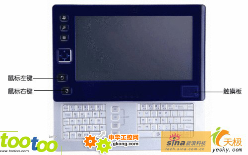 由于在高集成度方面,威盛的UMD解決方案相比同類產品具備明顯的優勢,因此U60的實際體積為192×120×27.9mm3,僅重720g。其中采用最新南北橋合一技術的VX700芯片組,其占用空間僅為35×35mm2,進而更能實現UMD輕薄短小的設計。此外,此款整機為全球首款量產的6.5英寸顯示面板的滑蓋UMD,雖然早期Sony也曾推出過滑蓋設計的UMD,但顯示面板大小僅為4.5英寸,小尺寸顯示屏幕也將使顯示效果和觀賞舒適度大打折扣,6.5英寸顯示面板的滑蓋設計就很好的兼顧了設計和舒適感。此外,技嘉的此款UMD在面板上加入了人體工學模擬鼠標的設計,使用者雙手操作UMD時,便能直接用左右手的大拇指使用鼠標功能,這一人性化的設計非常受歡迎。