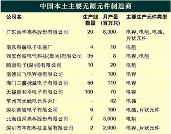 在中國(guó)本土生產(chǎn)的無(wú)源元件中,片狀元件占有很大部分。2004年產(chǎn)量估計(jì)達(dá)3,110億只,主要包括片狀鋁電解電容器、片狀電阻、片狀電感、晶片磁珠和MLCC,其中分別生產(chǎn)了1,600億只片狀電阻、1,350億只片狀電容器和160億只片狀電感,它們分別約占總體電阻、電容器和電感的80%、60%以上和30%以上。