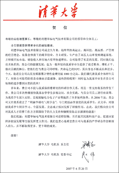 利德華福電氣技術有限公司成立九年來,始終堅持高起點、高科技、高品質、嚴管理的經營理念,依靠全體員工的艱辛創業,組主研發、生產出了高壓大功率變頻調速系統,并積極開拓市場,銷售收入和市場占有率快速增長,公司取得了長足的發展。同時我們也欣喜地看到,貴公司的健康發展,也為一批年輕的我系畢業生提供了接受教育、增長才干、做出貢獻的舞臺,是他們在與貴公司同呼吸、共命運之的同時,其自身也不斷成長和進步。今天,逢適公司取得高壓變頻器累計銷售1000臺之際,我們謹代表我系全體師生員工,對貴公司取得的優良業績表示最誠摯、最熱烈的祝賀!同時也為我系畢業生在貴公司取得的進步感到由衷的高興!
