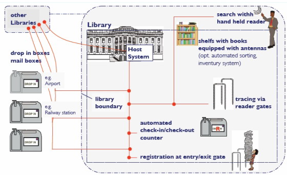 圖1說明了一個完全實現(xiàn)的圖書館RFID應(yīng)用。