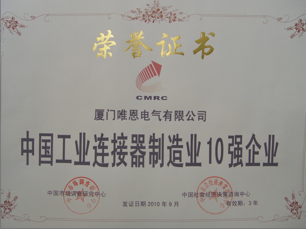 經(jīng)中國市場調(diào)查研究中心和中國社會(huì)經(jīng)濟(jì)決策咨詢中心對我單位申報(bào)的相關(guān)資料進(jìn)行量化分析和綜合考證,符合2010年度“中國工業(yè)連接器制造企業(yè)10強(qiáng)”的條件,經(jīng)研究決定,授予我單位“中國工業(yè)連接器制造企業(yè)10強(qiáng)”榮譽(yù)稱號(hào),并頒發(fā)榮譽(yù)證書和獎(jiǎng)牌。