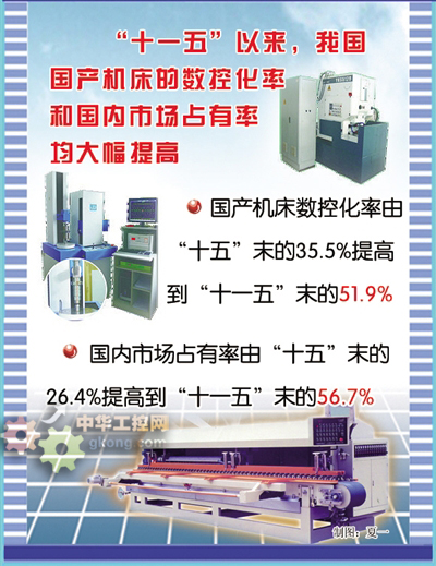 “十一五”以來,我國國產機床的數控化率和國內市場占有率均大幅提高。其中,國產機床數控化率由“十五”末的35.5%提高到“十一五”末的51.9%,國內市場占有率由“十五”末的26.4%提高到“十一五”末的56.7%。特別值得一提的是,專項實施在應對國際金融危機沖擊中發揮了積極作用,增強了重點骨干企業的創新和競爭能力。“十一五”末,我國機床企業前10名銷售收入之和已占到機床行業銷售收入的25%左右。