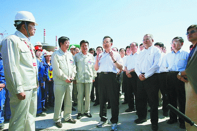 溫家寶總理隨后來到獨山子石化工程建設工地,這里正在建設年1000萬噸煉油及年120萬噸乙烯項目。看到總理到來,工地上一片歡騰。在年1000萬噸煉油常減壓裝置前,總理聽取了獨山子石化工程建設指揮部副總指揮胡永慶關于工程建設的匯報。溫家寶對工人說,我來看望大家,你們正在興建對新疆發展具有重大意義的工程。新疆發展能源項目有兩個優勢:第一,新疆自己有石油資源,又可以利用國外的油氣;第二,新疆既可以搞上游勘探和開采,又可以發展下游煉油和化工。這是新疆的優勢,又是新疆今后發展的基礎。溫家寶希望全體建設者共同努力,保質量、保安全、保工期,在確保質量和安全第一的基礎上,加強管理,提高效率,提高工藝水平,把獨山子石化正在建設的煉油廠、乙烯廠建成一流的工程。他相信,到明年,一個現代化的煉油廠和一個現代化的乙烯廠就會聳立在獨山子。