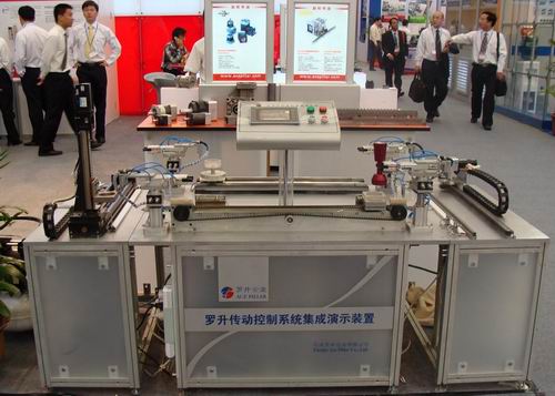 二、本次展會上,羅升將服務的傳動控制產品,進行整合,制成傳動控制演示裝置,集機、電、氣、儀一體化,通過模擬工件的運動控制,讓來賓直觀地了解傳動與控制的系統構成,以及能夠實現的功能。這套演示裝置的系統構成,包括了電氣控制單元、伺服滾珠絲杠直線傳動機構、精密齒輪齒條傳動機構、變頻皮帶傳動機構、無桿氣缸傳動機構、氣動抓取機構。這套裝置不但可應用于生產加工線、物流、機械手行業,亦可供企業培訓、學校教學實驗使用。