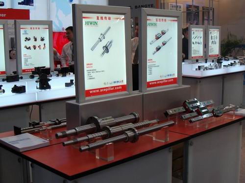 ①直線傳動區,展示了06-07年的最新HIWIN產品,包括直線導軌、滾珠絲杠、精密模組等,從三個特性出發精選產品:重負荷、高速度、高精度。