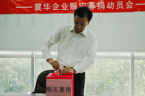 2008年5月16日,中華工控網(wǎng)(震華企業(yè))舉辦了“天災(zāi)無情人有情,震華企業(yè)獻(xiàn)愛心”為主題的抗災(zāi)賑災(zāi)捐贈活動。震華企業(yè)古總經(jīng)理發(fā)表了深情的捐贈倡議,并帶頭捐贈。隨后,各員工分別獻(xiàn)上了自己對災(zāi)區(qū)的一份愛心。