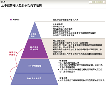 在對大型、分散型銷售團隊的運營方式進行改革時,僅僅有了正確的工具并不能加快改革進程或使改革成果持之以恒。但是,企業(yè)可以通過適當(dāng)?shù)姆椒▉韺崿F(xiàn)這種見效快的改革:即確定一組分布于整個組織之中、最合適的管理者群體來推動改革,并采納“大學(xué)方式”進行改革培訓(xùn),受訓(xùn)者又依次對他們下一級的員工如法進行培訓(xùn)。