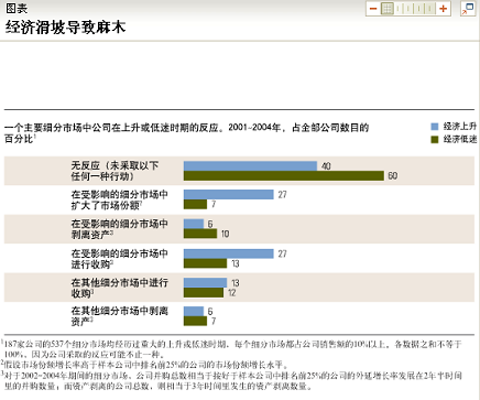 所有這一切都是可以理解的。隨著收入增長放緩,利潤空間縮小,管理層自然會把注意力轉(zhuǎn)移到削減成本和維持收益上。公司需要保護它的資產(chǎn)負(fù)債表,這種方式會導(dǎo)致公司增長放緩,低優(yōu)先級別的投資暫緩,大型收購計劃遭到擱置,公司甚至出售資產(chǎn)。許多公司僅僅是滯留原地:在我們的數(shù)據(jù)庫中,低迷時期有60%的公司在投資方面沒有任何動作,相比之下,在經(jīng)濟上升時期,僅有40%的公司沒有行動。