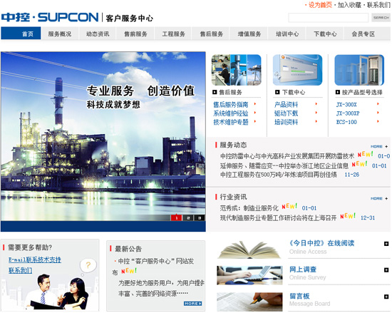 中控“客戶服務中心”欄目以“主動服務用戶”為中心,“滿足用戶需求”為宗旨,以新穎獨特的界面設計風格、豐富充實的網站內容、完善強大的網站功能為用戶搭建便捷、高效的信息獲取、在線支持和學習的網絡平臺。