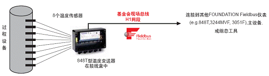 848T是基于基金會現場總線的8通道溫度變送器,-40oC~85oC的工作環境能力保證了它可以在現場安裝,并且每個848T只占用Ff總線網段上的一個站點;故在一個網段上可以連接多個848T,或與其它現場總線儀表、閥門混合連接;多通道溫變大量節省了常規需連接到控制室內的熱電偶補償電纜或熱電阻三芯電纜。