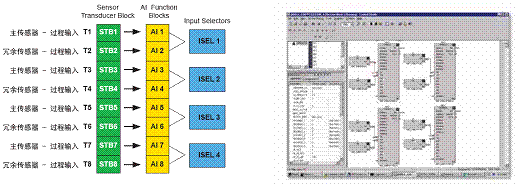 針對溫度傳感器容易損壞且長時間運行、不便維修的工藝場合,848T可應用于4個分組冗余溫度的監測,以提高現場信號的可靠性: