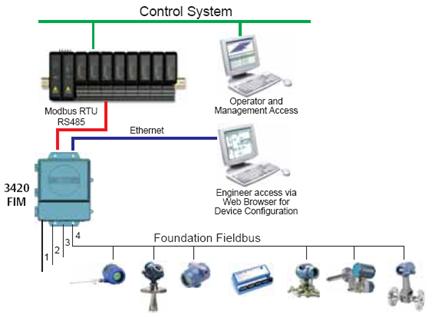 有時用戶會遇到如何在傳統的控制系統中加入FF功能的要求,比如傳統DCS改造項目中增加智能設備、上新項目但主系統是不支持FF總線的PLC控制器時;艾默生公司研發了一款現場總線接口模塊-3420 FIM,該模塊可提供4個H1網段,最多連接64個FF智能設備,它將現場的過程信號和控制指令轉換成標準的ModbusRTU或OPC通訊協議,與傳統控制系統或上位機直接通訊,并通過以太網連接AMS設備管理系統對FF智能設備進行管理和診斷,讓用戶獲得FF技術帶來的優勢和利益。