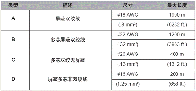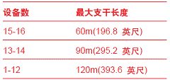若使用屏蔽雙絞線,現場總線電纜的長度不能超過1900m(6332英尺)。其中電纜的長度為主干長度加上所有支干長度,在終端器之間的區域部分定義為主干,所有離開主干的部分稱為分支,主干的兩端均設有終端負載。如果可以選擇支干的長度,則越短越好。支線的總長受支干數目與每條支干上設備的數量限制,如下表所示。