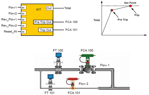 FT100和FT101分別測量大管道流量Flow1和小管道流量Flow2,其中在FT100是3051S FF差壓變送器;利用FT100的累計功能塊來計量Flow1和Flow2的總體累積量,當達到示意曲線中預設值Pre Trip點時,累積功能塊Pre Trip Out輸出開關信號關閉FCA100閥門,只用Flow2來作流量細調;當FT100中累積到設定點(Set Point)時再由功能塊Trip Out輸出開關信號,關閉FCA 101閥門;最后實現分程精密灌裝的功能。