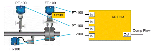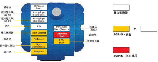 3051S在提供常規的功能塊(白色框所示)的同時,還具備了輸入選擇、算法、信號線性化、累計、顯示等標準功能塊配置,所有這些功能塊與DeltaV/Ovation系統中的功能塊是沒有任何差異的。其算術功能塊可方便地將來自溫度、壓力變送器的信號在3051S差壓變送器中計算出溫壓補償后的瞬時流量, 這樣操作人員可以在現場看到準確的、經過補償的流量值,而無需回到操作室看控制系統畫面。