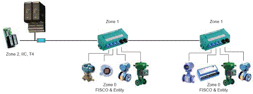 利用兼備隔離柵和接線盒功能的現場安全柵(Fieldbarrier)構成現場總線網絡的方法; Field barrier本身通常為增安型和澆封型防爆,可安裝在危險區Zone 1,內含隔離柵為EEx ia IIC,兼容FISCO和ENTITY標準,主干線電纜的長度和分支電纜的長度只受現場總線協議的約束(電纜總長1900米,分支見表1),不受FISCO規定的電纜長度總和不超過1000米和每分支不超過30米的限制。