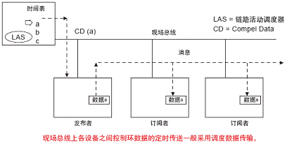 LAS有一份傳送時間表,記錄著要在一個周期內傳送的所有設備中所有緩存的傳送次數。當到了某一設備發送緩存的時刻,LAS即向該設備發出一項強制數據(CD)消息。一旦收到CD,設備即向現場總線上的所有設備廣播或"發布"緩存中的數據。所有組態為接收數據的設備即稱為"認購者"。 (見圖)