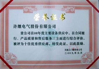 會上,三門峽供電公司公布了2008年度電力設備供應商評級結果。許繼電氣股份有限公司在合同履行、產(chǎn)品質量和售后服務三方面經(jīng)綜合評價,總分排名第一,被三門峽供電公司評為“十佳優(yōu)秀供應商”。