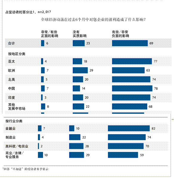在12月份的調查中,69%的受訪者表示經濟動蕩造成其企業盈利在過去6個月中出現了下降(圖表1) 。歐元區的高管持這種觀點的人數最少,而稱自己遭受打擊的在中國的高管數量最多。值得注意的是,根據對6月份我們調查的類似問題的回答,許多企業的實力已經較6個月前有所下降,在6月份的調查中,有57%的受訪者稱美國的經濟低迷已經給其企業造成了負面影響。