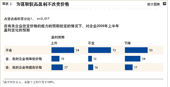 在本次調查中,有近2/3的受訪者稱,其盈利下降的主要原因是消費者或其他企業的支出下降。但有意思的是,大多數企業并沒有試圖通過降價來鼓勵客戶支出:55%的人稱,其企業從9月份以來一直保持價格穩定,還有18%的企業提高了價格。但中國的情況與眾不同;有40%的高管稱其企業降低了價格,盡管該數據并未顯示降價是對盈利下降的回應還是造成盈利下降的原因。展望未來,高管們似乎傾向于認為,在2009年上半年保持價格穩定與獲得較高利潤之間的聯系會更加緊密(圖表2)。