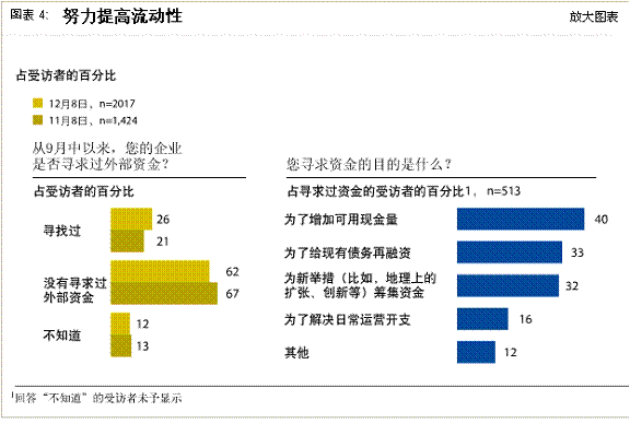 公司裁員的計劃可能與對現金的需求關系更大。自從9月中旬以來,有26%的企業尋求過獲得外部融資,盡管這一比例依舊保持較低,但比一個月前上升了5%(圖表4)。在尋求過融資的企業中,有40%的人選擇的原因是提高可用現金量,這高于其他原因?!?BR>