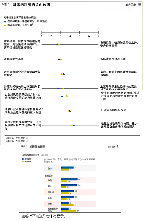此外,有略高于半數的人認為其國家將在2009年第一季度將會出現通貨緊縮(圖表7)。中國和亞洲發達國家的高管更傾向于預期通縮的出現4。(這些高管還最傾向于預期將在第一季度降低價格,盡管有略多一些的人預期將保持價格穩定。)