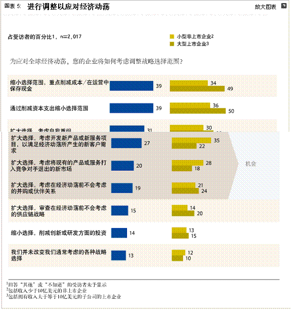 與之類似,當被問到為了應對經濟動蕩,將如何調整所考慮的各種戰略選擇時,高管們表示,他們正在縮小選擇范圍,將保留現金和削減資本支出作為唯一關注重點(圖表5)。